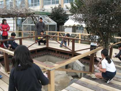 中庭のウッドデッキが古くなっていて,現在,学校運営協議会やPTAの方々を中心に修理していただいています。
