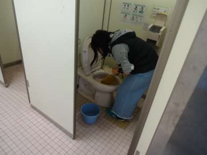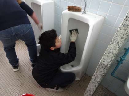 掃除の前には除菌のクリームを手に刷り込み,ゴム手袋をしてからおこないます。掃除に学ぶ会の皆さんに,お掃除のコツを聞きながら,子ども達は一生懸命におトイレに向かっていました。