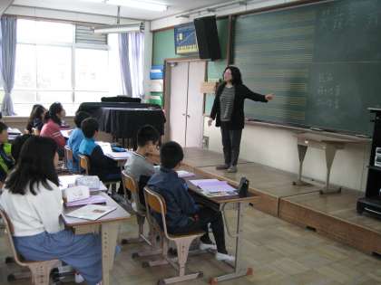 「葭」という漢字をなかなか正しく読んでもらえないという先生の自己紹介から,子どもたちは好きな音・嫌いな音など,音楽らしい自己紹介をしました。