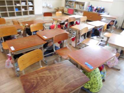 子どもたちは、すばやく机の下に一次避難し、その後も静かに運動場へ避難することができました。