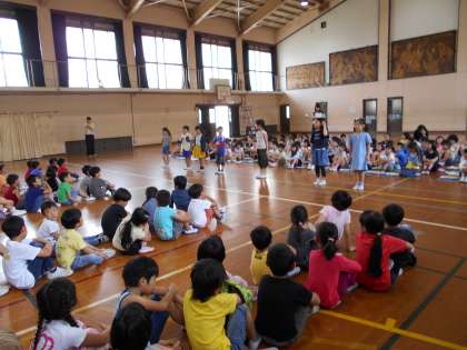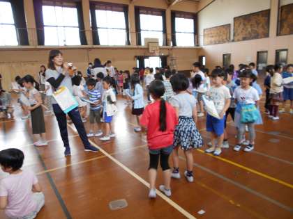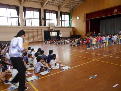 体育館ではじめの言葉や、気を付けることを確認し、出発しました。2年生はやさしく手をつないでくれました。