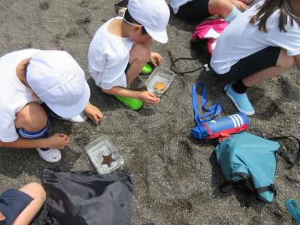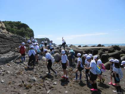 絶好の磯浜観察日和となりました。宮崎浜へ行く途中には,素晴らしい海岸を見下ろすことができる絶景ポイントもあり,思わず「わぁ,すごい!」という歓声もあがっていました。はじめには,志摩マリンランドの職員さんに潮の干満について学習し、続いて,持ってきていただいたヒトデを観察しました。一人に一匹のヒトデを前に,触ったり,その様子を見たりして,興味深い時間を過ごしました。