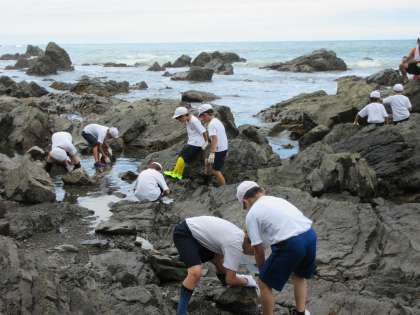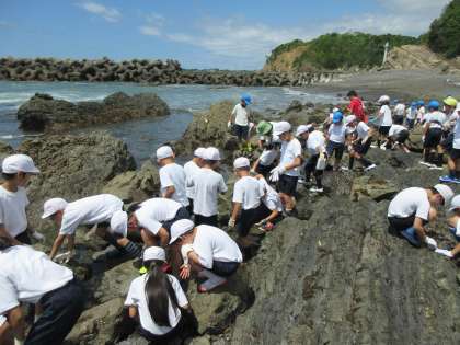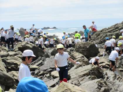 いよいよ,それぞれの場所に分かれ,磯浜観察に入りました。ところどころ滑りやすかったり,とがっていたりして,歩きにくい岩ばかりでしたが,子どもたちは楽しいひとときを過ごしました。干潮の時刻とも重なり,日ごろでは見えないような岩場の生き物も観察することができました。