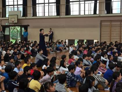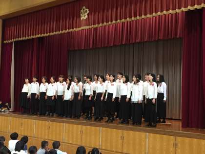体育館に全校児童が集まり,緞帳が上がると,正装をしたお母さんたちが舞台に現れ,次週,京都コンサートホールで発表される2曲(「花は咲く」「リメンバー・ミー」)を披露していただきました。素晴らしいハーモニーに魅せられ,子どもたちも真剣な眼差しで,鑑賞しました。