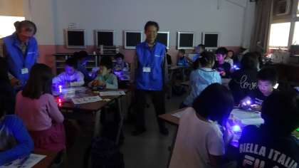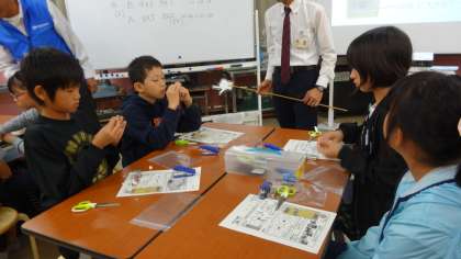 工房での学習では,ロームの会社で作られているLEDを使った電子工作をしました。ロームが製品を作る際に大切にしていることは,「品質」だということで,子ども達も自分の作品を丁寧に作りました。ホッチキス止めに苦戦している姿も見られましたが,スイッチを押したときに色々な色のライトが光ると,とても嬉しそうでした。