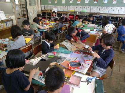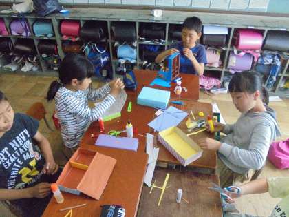 図画工作科「ランチをどうぞ」の学習で,持ち寄った箱に画用紙などで飾り付けをしてお弁当箱を作りました。
