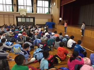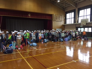 小雨交じりの朝となりましたが,午前8時30分には,103名全員が元気に集合しました。体育館では,さっそく出発式を行い,見送りにきていただいた保護者のみなさんの方を向いて「行ってきま〜す」をしました。いよいよ3泊4日の長期宿泊自然体験学習(花背 山の家)が始まります。少し雨は降っていますが,子どもたちの元気パワーで,雨雲を撃退してほしいです。