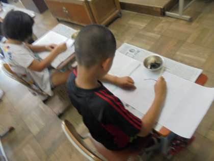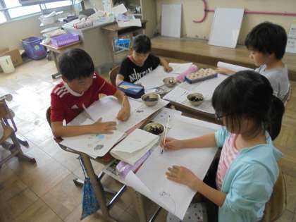 みさきの家野外活動で楽しかった思い出を3つほど選び、長い和紙に割りばしペンを使って絵と言葉をかきました。それぞれの心に残っている活動を思い出しながら、楽しく思い思いに描いていました。