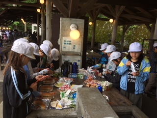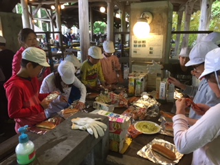 朝の集いを終え,第1炊飯場へ向かいました。さあ,朝食づくりに取り掛かります。今朝のメニューは,山の家特製の「パックドッグ」です。毎年の5年生は,3日目の朝に,このおいしい思いを体験しています。パックドックの作り方は,いたって簡単です。パンの中に野菜とソーセージを入れ,アルミ箔に包んで,牛乳パックごと,燃やします。すると,アツアツの朝食が出来上がるのです。ほとんど失敗はありません。