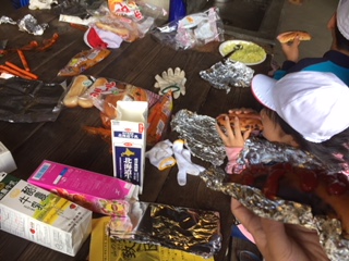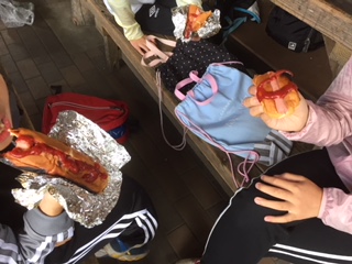 「できたー」待ちに待った出来上がり。アツアツのパックドックにケチャップをつけ,お腹の中へ。思わず「うまい!」という歓声があがっていました。