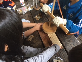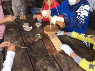 野外炊事の火の源を作る「火おこし」に,グループの力を結束して挑戦しました。なかなか根気のいる活動で,そう簡単には,おこせませんでした。しかし,少しずつ成功につながる例も見られ,そのうちに「ぼくの班でも起こせるかも。」という思いで,頑張り度に拍車がかかりました。