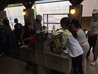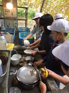 野外炊飯の前には,一度,すべての道具や皿を洗ってから,始めます。これから,カレーづくりを始めます。