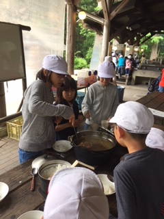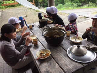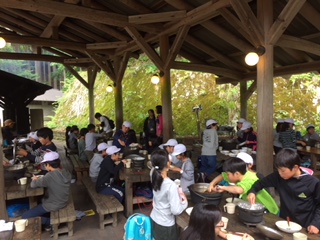 みんなで楽しく「いただきま〜す」。朝のパックドックに引き続き,昼食のカレーライスが出来上がりました。この朝食では,カレーのみならず,ご飯の出来具合も相当大切です。みんなで,慎重に炊きあげました。朝も昼も,大成功です。みんなで,楽しくカレーライスを完食しました。