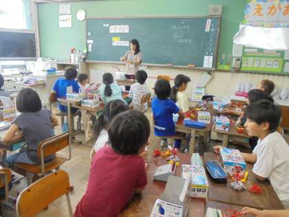 理科の学習で電池のはたらきについて調べています。専用のキットを組み立て、プロペラの回る向きを調べたり、検流計を使って電流の向きを調べたりしています。調べて予想が当たると、「ほんまや!」などという声が聞こえます。実際に自分たちで実験をして調べていくのがとても楽しそうです。