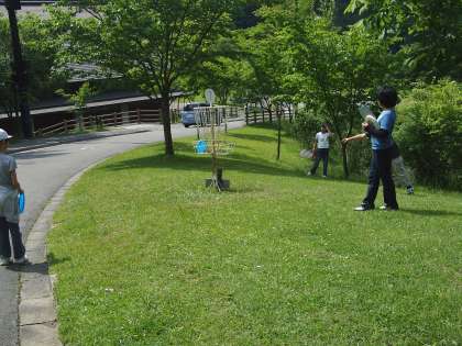 フライングディスクゴルフをチームに分かれて行いました。広い山の家の敷地内にある起伏の激しいコースを回るのは、結構大変でした。