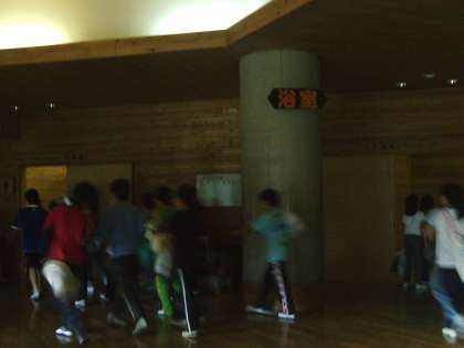 予定通り4:30〜入浴です。写真のような広い脱衣場と湯船です。しかし、プールと間違っているのではないかと思われるような入り方をする子供も何人か…。びっくり。明日は、きちんと指導したいと思います。