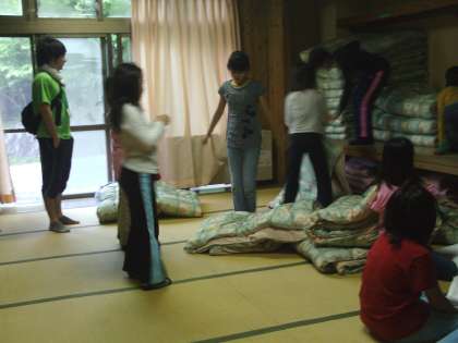2日目。みんな元気にお目覚めです。ふとんをかたづけて、歯磨き・洗顔です。