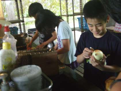 みんな声を掛け合って協力してカレーの準備をしています。かまど組もしっかり準備でき、野菜が切れあがるのを待っています。その待ち時間を使って少し上の方まで杉の落ち葉を拾いにいきました。