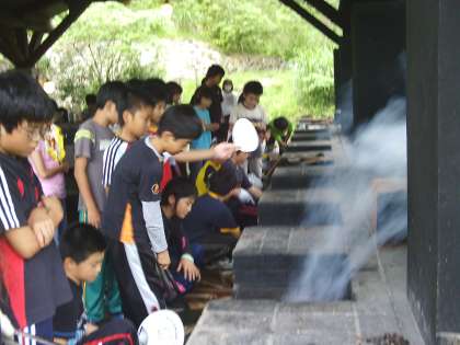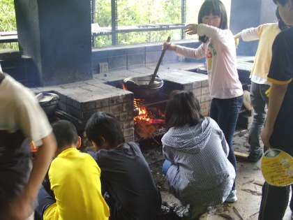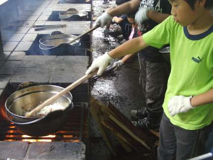いよいよかまどに火がつきました。「けむい、けむい」「今、うちわであおいじゃだめ」「そんなにさわったら火が消える」…かまどの周辺は大騒ぎです。