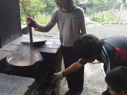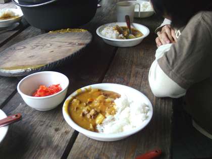 かまどの火も順調です。おいしそうなカレーができました。見てください。このカレー。匂いと味をお届けできないのが残念です。