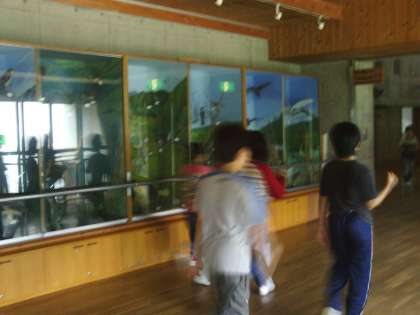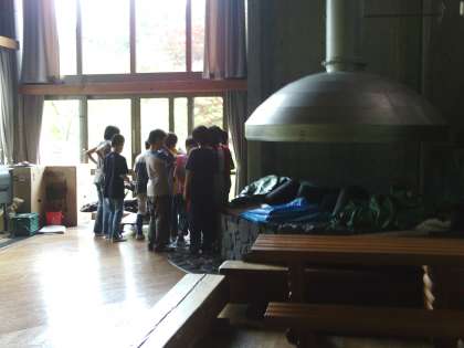 夜から雨の予報に「テント泊」を明日に変更したため、午後からの活動に余裕ができました。そこで、2:00〜3:30冒険の森、4:00〜4:40館内オリエンテーリングを行うことにしました。
