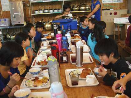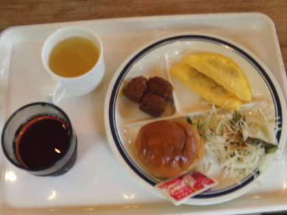 3日目の朝食です。ジュースか牛乳か、スープか味噌汁か選べます。ある子どもの選んだ朝食です。並び方、取り方、片付け方も慣れてきました。