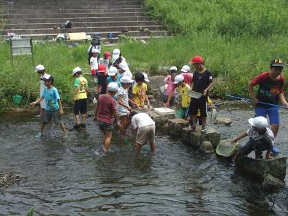 「川遊びを楽しもう!」宝ヶ池公園のそばにある川で生き物見つけをしました。初めに約束を聞いてから、恐る恐る川に入りました。