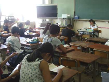 各クラスで、ドリル直しや読書、先生の昔話…など。全員ではありませんが、友達が集まって楽しく時間を過ごしていました。夏休みの残りも元気に過ごしてほしいと思います。