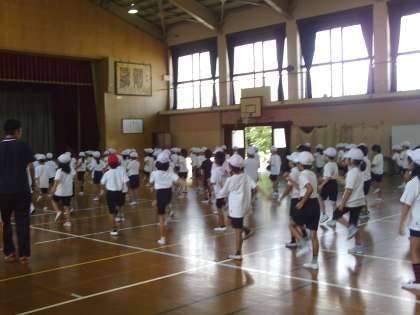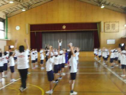 2年は団体演技で「マルマルモリモリ」をします。がんばって振付を練習しています。