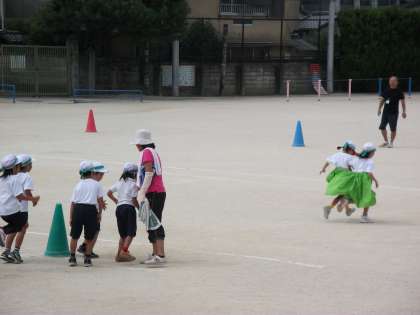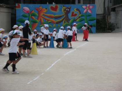 1年生は今日は「デカパンリレー」の練習をしました。デカパンをはいて2人で走ります。でも、走るよりはいたり脱いだりに時間がかかってしまう組もあります。これからも練習していきます。