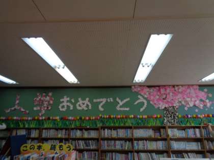 図書館の壁面には,図書ボランティアのみなさんが作ってくださっている季節に合わせた素敵な飾りがあり,今日までは「入学おめでとう」と桜やチューリップのお花が美しく咲いていました。次はどんな飾りになっているのか,それを見るのも図書館へ行く楽しみの一つです。いつもありがとうございます。