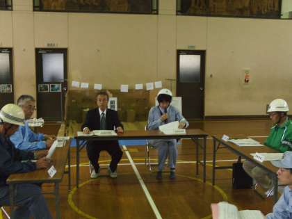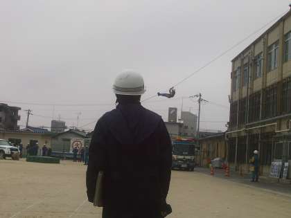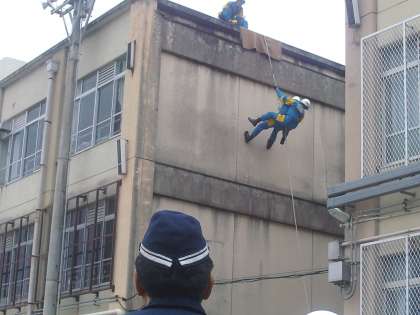 写真は、屋上からの救出訓練・避難所運営訓練の様子です。