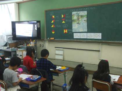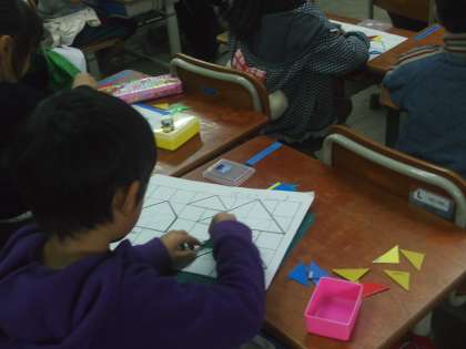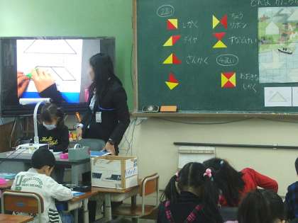 算数科「かたちづくり」で、小さな三角の色板を使って、色々な形を作ります。まず2枚で作れた形に名前をつけます。次に、大きな形の中に2枚で作った形を探します。最後に、小さな三角の色板が何枚使われているか考えます。色板を操作して形作りしながら、図形に慣れていきます。