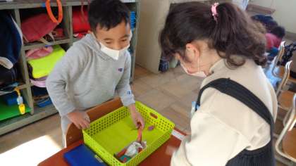 生活科の秋見つけで集めた材料を使って、おもちゃや飾りを作りました。最後はみんなで友達の作品を見合ったり、遊んだりしました。「上手だねって言ってくれて嬉しかった」「たくさんお客さんが来てくれて嬉しかった」という感想がありました。