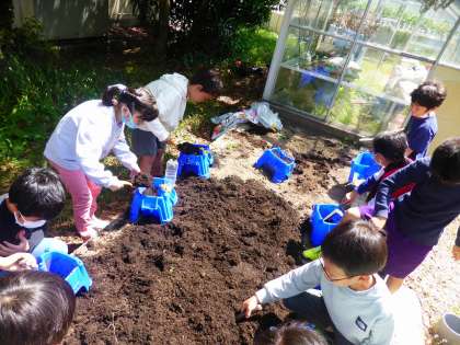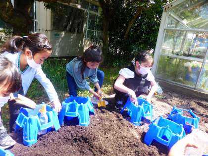 生活科の時間に、ミニトマトの土づくりをしました。おいしいミニトマトができるように,新しい土や肥料を混ぜました。ミニトマトがよく育つように、しっかり混ぜ、ふかふかな土にしていました。初めての野菜作り、みんな頑張っていました。