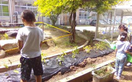 子どもたち念願の野菜を植えました。大葉・パセリ・バジル・ナス・キュウリをみんなの畑に植えました。子どもたちはそれぞれ自分の担当の野菜を決めて、お世話をがんばっています。どんな風に育つのか楽しみです。