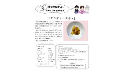 「タンドリーチキン」は、新献立です。鶏肉にカレー粉やにんにく、ケチャップなどで味をつけてスチームコンベクションオーブンで焼きました。