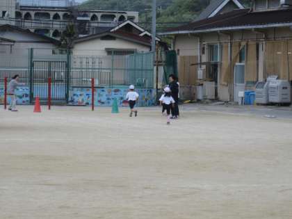 運動場で50メートル走をしました。今日はあいにくの天気で,子どもたちは寒さに震えていましたので,体ほぐしをし,1回だけ走りました。