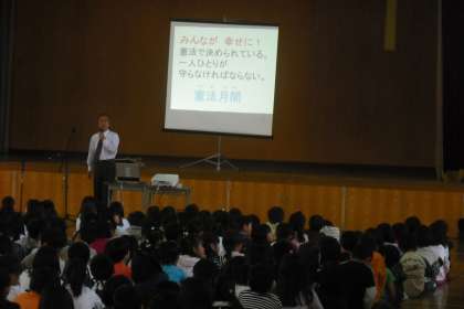自分だけが幸せ(人のことはどうでもいい)と言う考えは、本当の幸せと言えるのだろうか…。子どもたちに考えてほしいと思いました。自分も人も幸せ!それが憲法で言われていること。毎日の生活の中で憲法が守られているのかクラスで話し合ってもらうために朝会で子どもたちに歌とお話をしました。