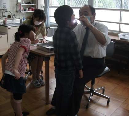 5月・6月と4回に分けて歯科検診が実施されます。今日は、ひまわり学級と1年生と3年生の2クラスが岩崎歯科校医さんに歯と口腔の状態を診てもらいました。