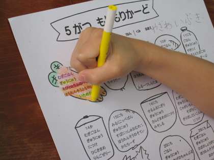 1年生は,給食の時間にもりもりカレンダーを5月7日からつけています。自分で食べられる量を決めて時間内に食べられた人はもりもりカレンダーに色をつけていきます。5月中やっていきます。6月の給食試食会に見ていただく予定です。