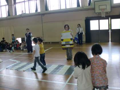 はじめに,交通ルールのお話を聞いてから実際に作っていただいた道を歩きました。細い道・太い道・路側帯・横断歩道の渡り方について練習しました。途中に車が通った時などのとまり方も練習しました。
