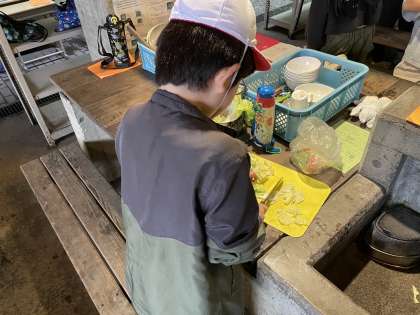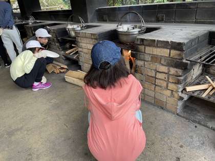 材料を細かく切ったり、かまどに木を入れたりして、火が消えないように見守っています。美味しいすき焼き風煮込みができるのが楽しみです。