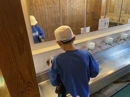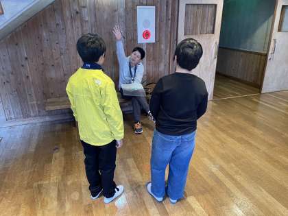 朝の集いに向けて、担任の先生とリハーサル。今日は花背山の家に来ている他の学校と合同で行います。5分前行動で集合です。