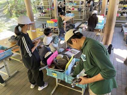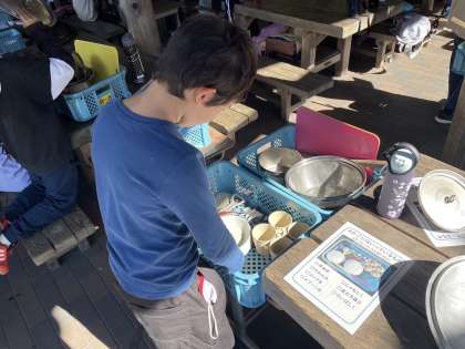 食器の数を数えたり、鍋を磨いたり、みんなで役割を分担して片付けています。