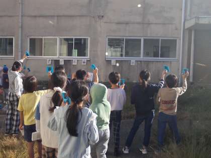 今日は、鏡を使って、光を反射させ、的に向かって当てる遊びをしました。