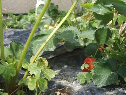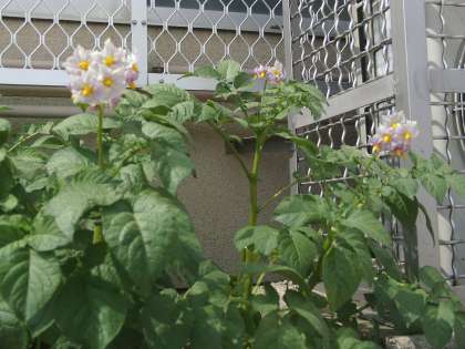 薄紫色のかわいい花…じゃがいもの花です。エンドウの白い花も咲いています。葉っぱの奥に小さなイチゴも…。これは、職員室の南側の花壇に咲いている花達です。ひまわり学級が育てています。