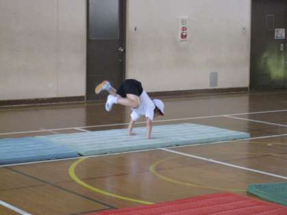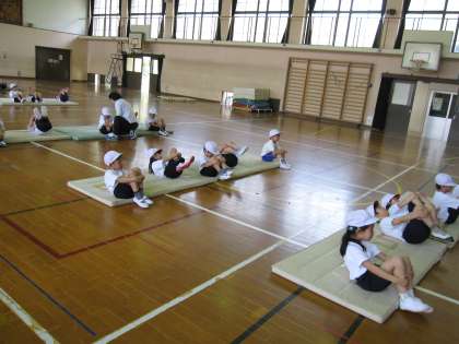 マットあそびで,前回もしたゆりかごに加え,ロバキック・前回りなどの動きも練習しました。新しい技に挑戦して,子どもたちは楽しいそうです。