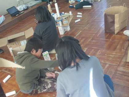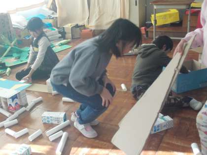 作品台を作るので、3校一緒にグループになって積み重ねたり飾り付けを行いました。
