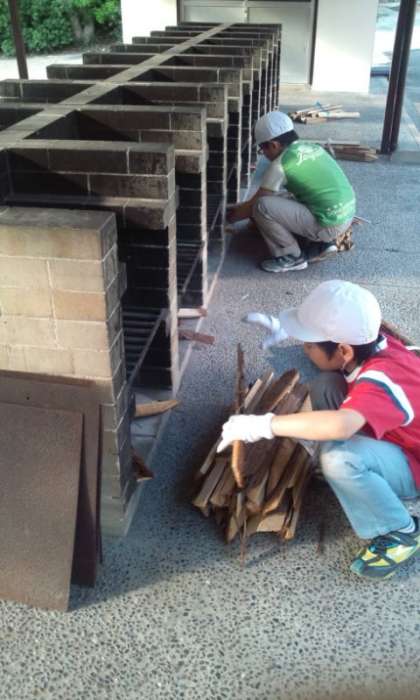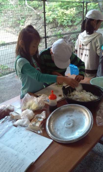 慣れない手つきで野外炊事がはじまりました。みんなで協力して食事を作ります。うまく火をつけることができたでしょうか。